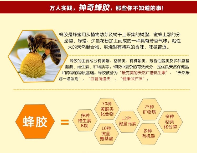 蜂胶的主要成分有黄铜、萜稀类、有机酸类、芳香性醛类及多种氨基酸酶、维生素、矿物质等,蜂胶中复杂的有效成分,是优良天然保健品和药物的物质基础。蜂胶被誉为“最完美的天然广谱抗生素”、“天然米娜一增强剂”、“血管清道夫”、“健康保护神”。